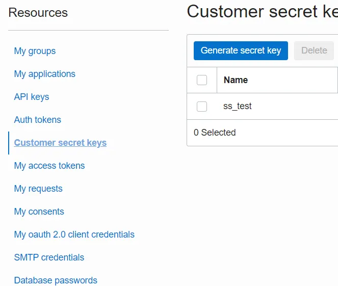 좌측 하단에, Customer secret keys를 클릭하고 Generate secret key를 클릭하여 key를 생성한다.