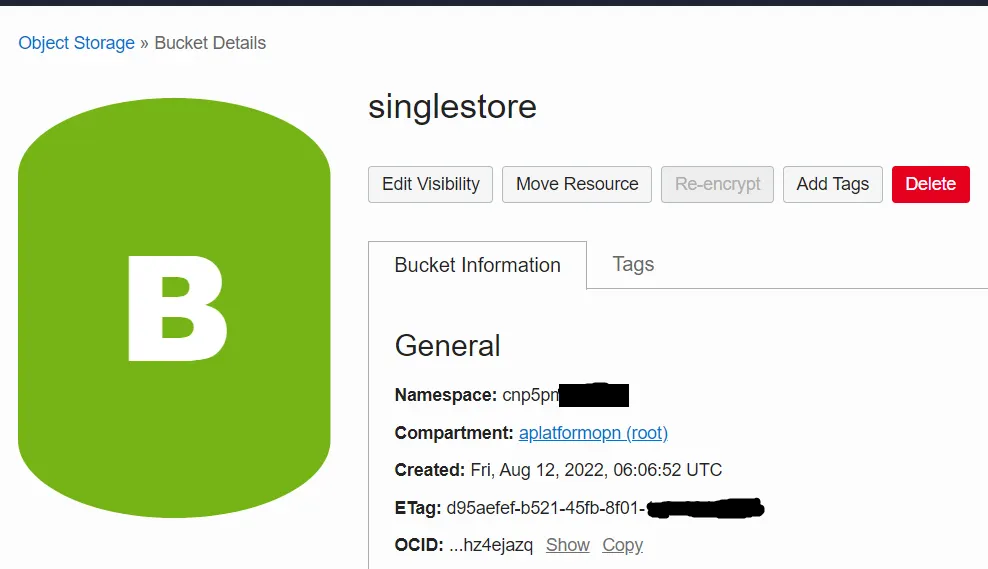 생성된 Bucket을 클릭하여, Namespace를 조회한다.