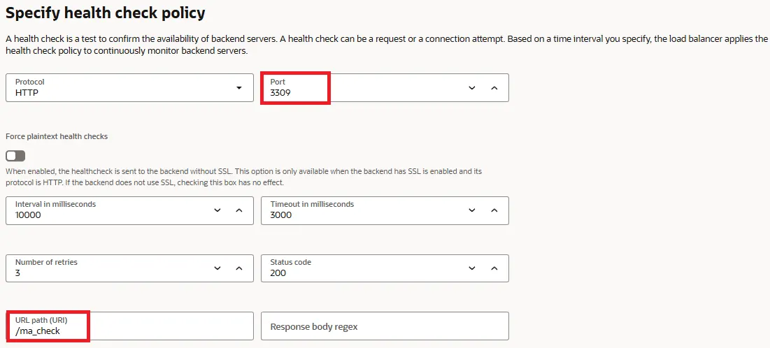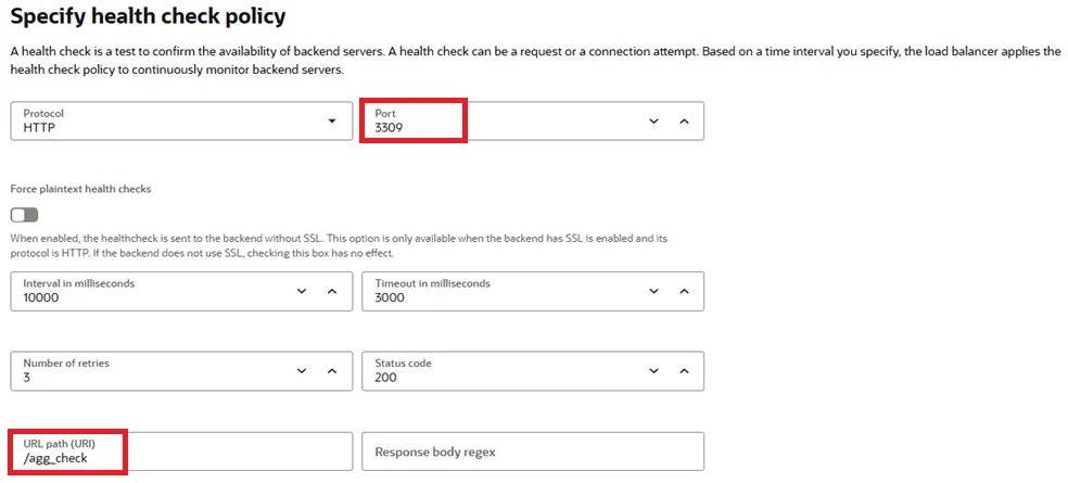 health check 정책 설정 시 Health-check HTTP port(3309) 와 url path(/ma_check) 을 입력합니다.