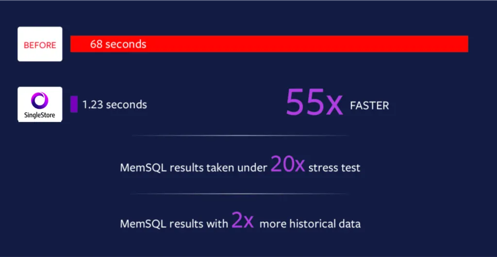 단일 파트너의 재무 데이터 집계(계속 반복해야 하는 작업)하는데 기존 솔루션에서 68초가 소요되었으나 Single Store에서 1.23초가 소요되어 55배 더 빠른 성능을 보여주었습니다.