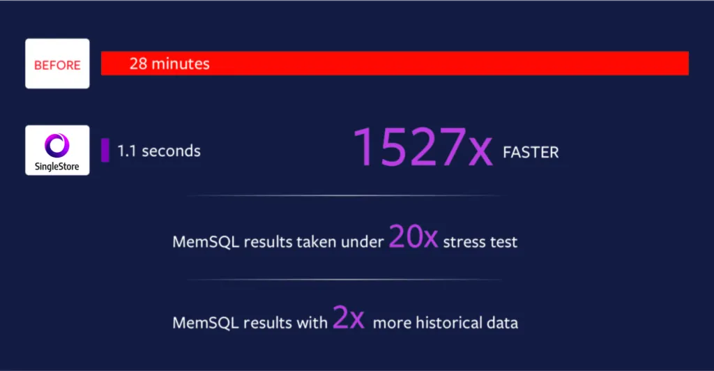 월별 보고는 특히 고객이 재무 보고서를 요구하거나 청구서를 지불할 때 매우 중요합니다. 기존 시스템에서는 한 달 동안 전체 플랫폼의 단일 재무 데이터 포인트를 합산하는데 28분이 소요되었으며, Singlestore에서는 1.1초가 소요되어 처리속도가 1500배 이상 증가했니다.