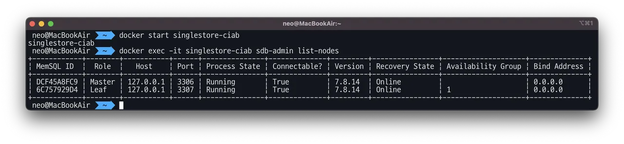SingleStore 를 시작하고 node list 를 확인합니다.