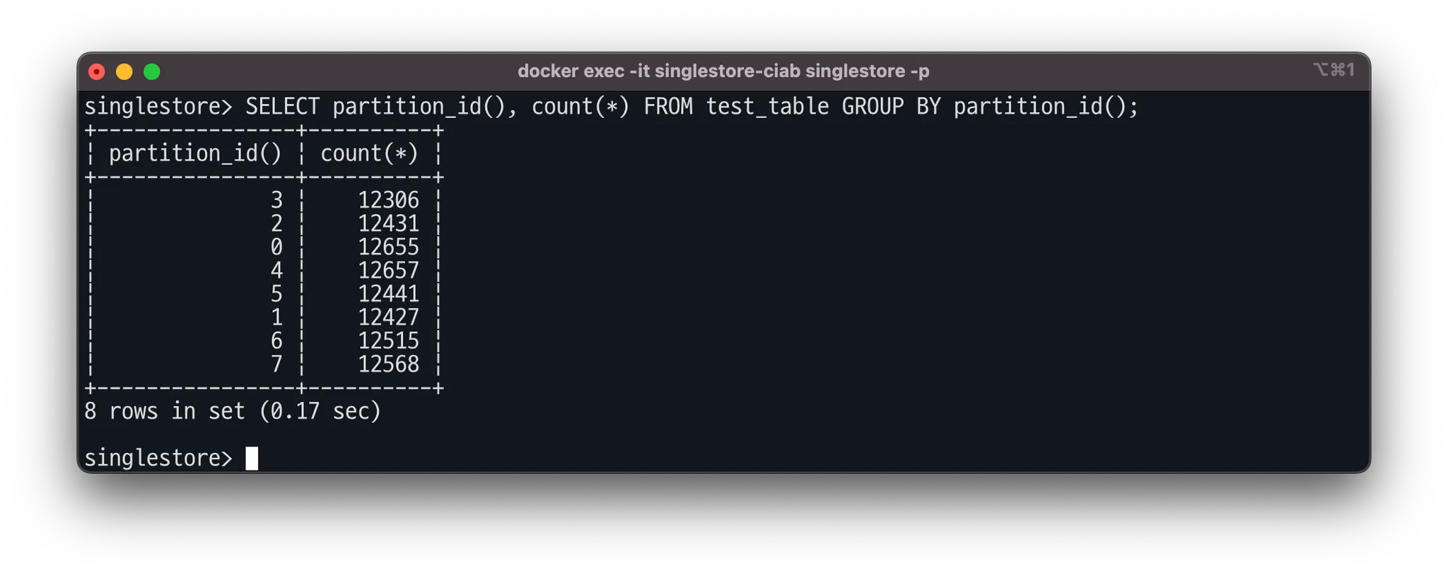 SELECT partition_id(), count(*) FROM test_table GROUP BY partition_id();
