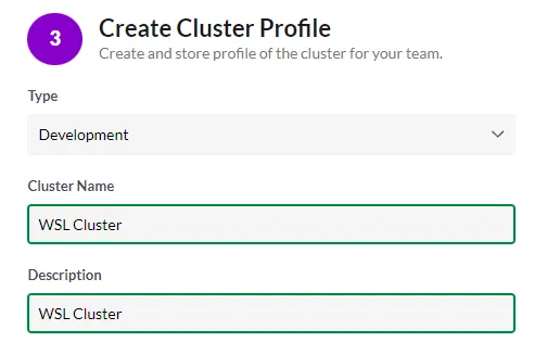 Create Cluster Profile 화면에서 Type 은 Development, Cluster Name, Description 은