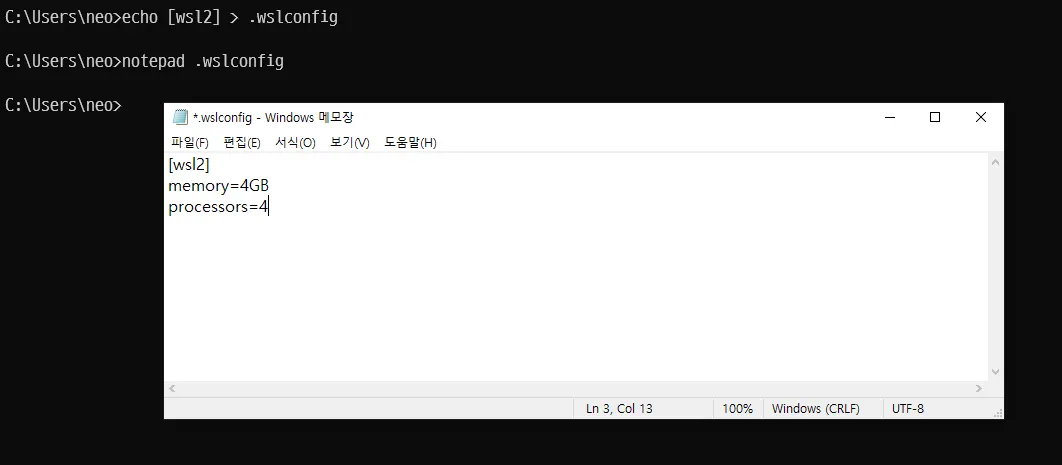 노트패드로 아래와 같이 WSL2 에서 사용할 CPU 프로세서 수와 메모리를 설정하고