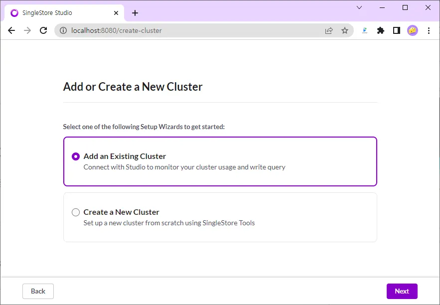 Add an Existing Cluster 를 선택하고 Next 를 클릭합니다.