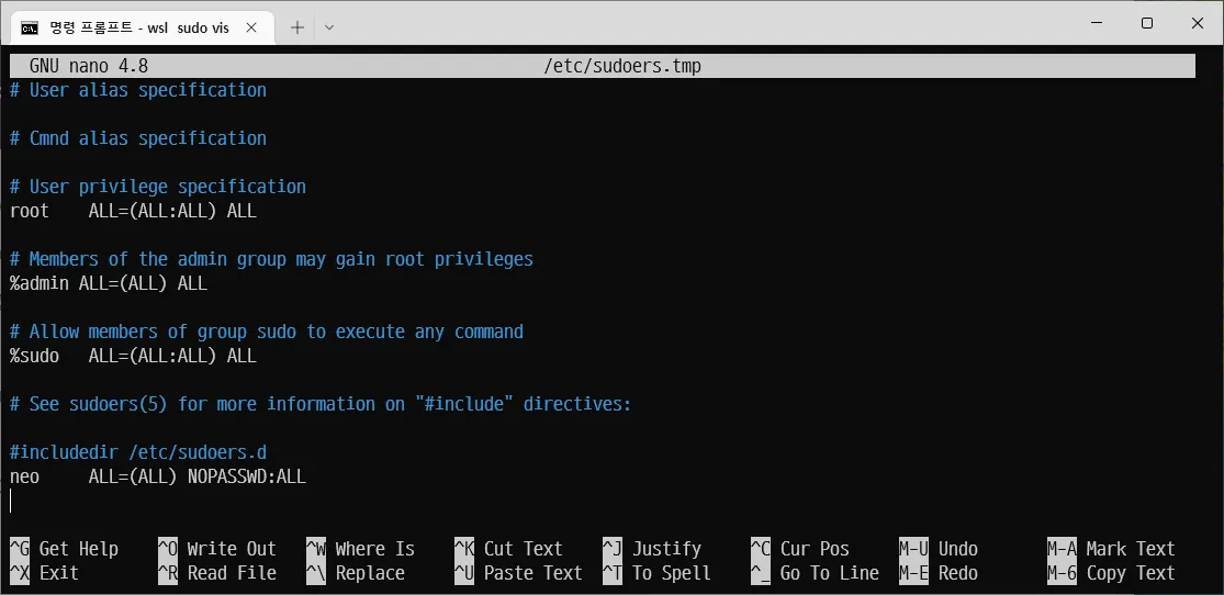 ctrl + x 및 Y, Enter 를 눌러 저장 후 편집 화면을 종료합니다.